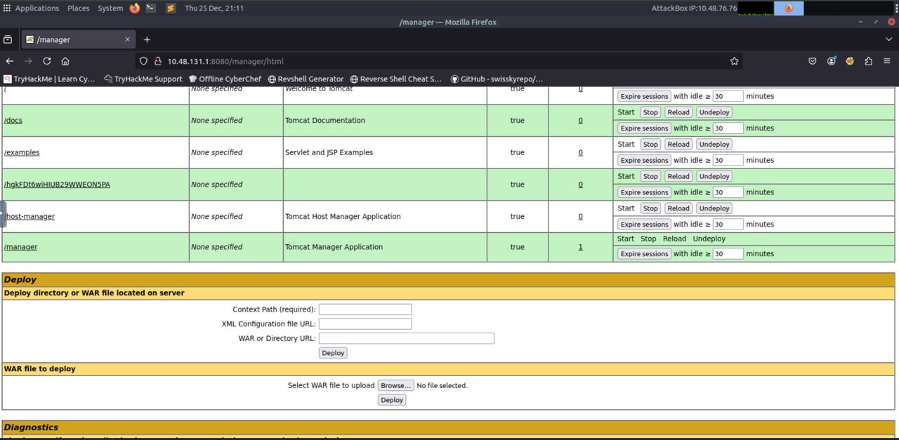 Using the discovered credentials, I successfully logged into the Tomcat Manager dashboard.